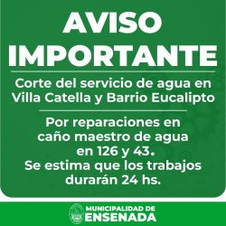 Informamos que, debido a reparaciones en un caño maestro ubicado en 126 y 43, se reporta un corte del servicio
