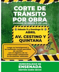Recambio de cañería Ø 450 mm. Av. Cestino y calle Quintana. Sábado 11 y Domingo 12 de abril. Le pedimos
