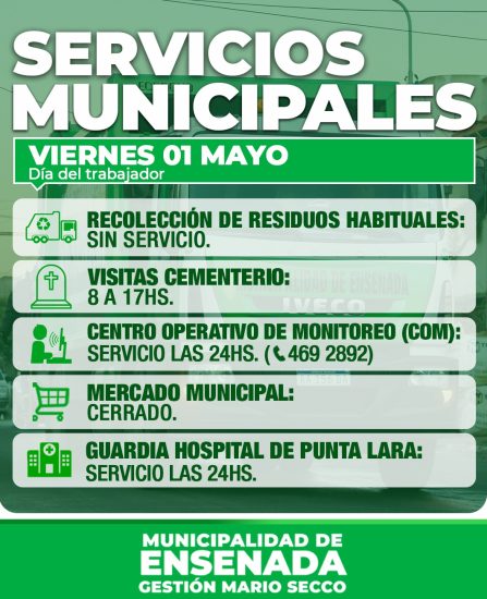 Se informa como será el funcionamiento de los servicios municipales en la ciudad de Ensenada durante el viernes 1° de mayo, feriado por el Día Internacional de los Trabajadores: