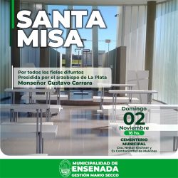 Este domingo 2 de noviembre se brindará una santa misa por todos los difuntos en el Cementerio Municipal de Ensenada. La ceremonia iniciará a las 16hs. y será presidida por el Arzobispo Gustavo Carrara.
