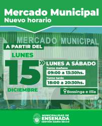 Desde el lunes 15 de diciembre el Mercado Municipal de Ensenada (Bossinga e Illia) cambia su horario de atención: LUNES