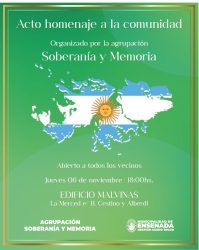 ACTO HOMENAJE A LA COMUNIDAD / Noticias / Por Prensa Ensenada La Agrupación Soberanía y Memoria llevará adelante un reconocimiento a la comunidad este jueves 6/11 en el Edificio Malvinas. El evento es abierto a todos los vecinos, a partir de las 18 horas.