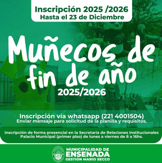 Sigue abierta la inscripción de muñecos para la quema de fin de año y recibimiento del 2026. Las planillas podrán solicitarse por wsp al 2214001504 o de forma presencial en la Secretaria de Relaciones Institucionales, de lunes a viernes de 8 a 16hs. Los muñecos no podrán construirse en avenidas o calles por dónde circulen