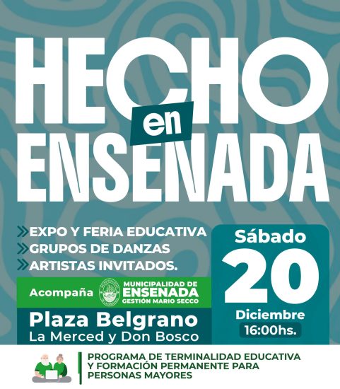 Este sábado 20 de diciembre desde las 16hs. se llevará adelante la expo y feria educativa «Hecho en Ensenada». Durante la jornada se podrá disfrutar de stand de los distintos talleres del programa de Terminalidad Educativa y Formación Permanente para Personas Mayores, espectáculos artísticos, juegos y sorpresas. Te esperamos en plaza Belgrano (La Merced y