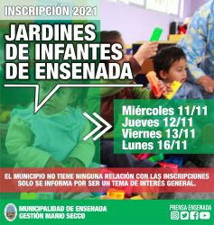 JARDINES DE INFANTES DE ENSENADA Miércoles 11, Jueves 12, Viernes 13 y Lunes 16 de noviembre Jardín 901: San Martín n° 771 – De