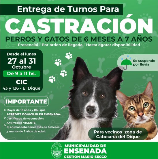 Reforzando las campañas de zoonosis en los barrios, hasta el viernes 31 estaremos entregando turnos para castración de perros y gatos de 6 meses a 7 años de edad para vecinos de la zona.