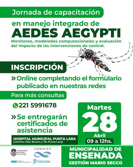 Para continuar reforzando la prevención contra el dengue, el martes 28/04 de 9 a 12 hs. en el Hospital Municipal de Punta Lara llevaremos a cabo una Jornada de Capacitación en manejo integrado de Aedes Aegypti: monitoreo, modelados computacionales y evaluación del impacto de las intervenciones de control: Resultados del proyecto FITBA 2024-213C UNLP-Municipalidad de Ensenada