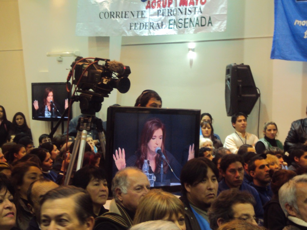 Cerca de las 11 el recinto de calle La Merced ya se encontraba colmado de vecinos del distrito y un buen número de militantes del Frente Para La Victoria de Ensenada. Del acto también participaron autoridades locales y el Administrador de ENOHSA, Ing. Edgardo Bortolozzi a cargo de la ejecución de las obras cloacales realizadas en el distrito. A las 12 se estableció contacto con la Presidenta Cristina Fernández a través de una video conferencia que incluyó no solo al intendente Mario Secco sino también a dos vecinos del distrito de Ensenada; uno del barrio Cambaceres y otro comerciante de la ciudad.
