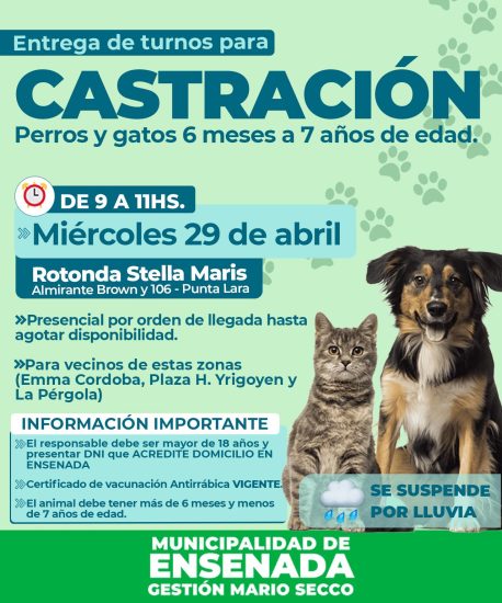 Hoy, miércoles 29 de abril de 9 a 11 horas., se llevará adelante una entrega de turnos para castraciones en Camino Almirante Brown y 106 (Punta Lara).