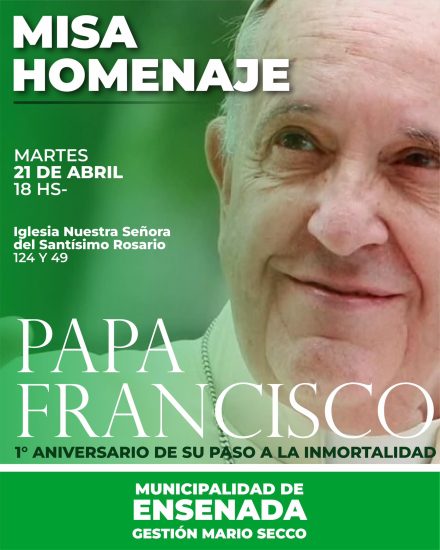 A un año del paso a la inmortalidad del Papa Francisco, este martes 21/4 realizaremos una misa homenaje en la Parroquia Nuestra Señora del Santísimo Rosario de calle 124 y 49 (El Dique) a las 18 horas.